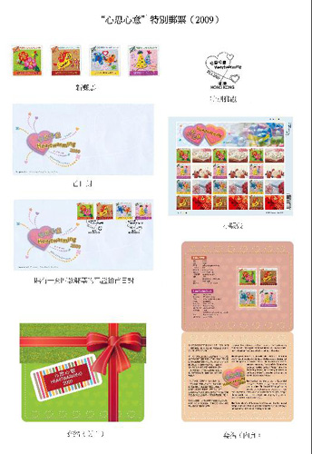 新一辑“心思心意”邮票的设计风格,与2007年发行的第三辑邮票彼此呼应,同样以五彩缤纷的戟绒拼贴成画,展现中西文化相异而又共融的妙趣。中国舞狮锣鼓喧天,喜气洋洋,西式派对热闹欢愉,乐也融融,点出“纪念志庆”。大地百花吐艳,暖暖人间,蝴蝶俪影成双,翩翩飞舞,尽见“爱与关怀”。